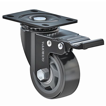 Descrição -Rodízio giratório com freio, fabricado em chapa de aço com acabamento em pintura eletrostática KTL cor preta, possui cabeçote de giro com duas pistas de esferas. A versão com freio tem duas funções, atua travando a roda e o cabeçote de giro. Eixo da roda parafusado. Roda Revestida em Composto Termoplástico com PVC dureza 85 Shore “A” na cor preta, núcleo em polipropileno copolímero recicláveis e dois rolamentos de esferas.
